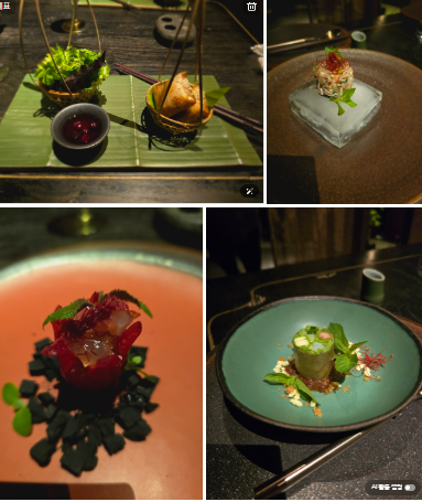 저도 처음 가보는데 진짜 엄청 고급진 채식 레스토랑입니다. 음식 비주얼은 완전 캡숑인데, 맛은 글쎄요~~~고수 좋아하시는 분들은 괜찮아요. 일반인 분들한테는 여긴 추천하지 않겠습니다. 총11가지 요리가 나오고 요리마다 예술입니다. 인스타 올리기에는 좋은 식당이에요. 비용은 인당 기본 1,000k동(55천원)에 와인 1병이 최소 2,850k동 입니다. 저희 가족은 와인안먹고, 살구맛 와인(?)과 생수 포함해서 4,801k동(27만원) 정도 나왔습니다.